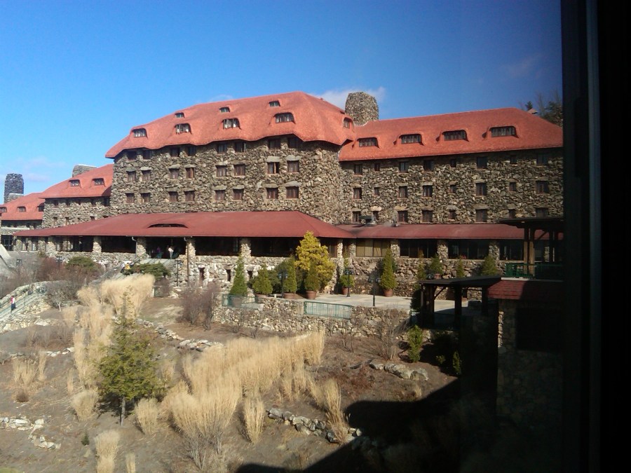 There is a special holiday buffet offered at the Grove Park Inn each year from Thanksgiving through the first of January, which makes it the perfect time to gather up some friends and make the trek up the mountain. Host to several presidents, dignitaries and entertainers, (including a recent visit by our own Pesident Obama), this regal old stone hotel/golf course/spa is decked out with a reindeer- pulled-sleigh in one giant fireplace in the lobby where families are lined up for a photo op. The other has logs ablaze, faced with rocking chairs filled with guests soaking up the ambiance. Between them a giant tree glows floor to ceiling and the connecting hallways have a plethora of trees adorned in various styles; fishermen with rods criss crossing the trunk and fish dangling from their lines; another is all peacocks and feathers; while my favorite is wrapped in grape vine and tiny bottles of merlot, and pinot grigio hang from its limbs along with decorative corks and grape clusters. But nothing can compare with the rooms of food that make up the buffet. Salads, soups, cheese, smoked trout and salmon, boiled shrimp, melons, fruits, breads, hot foods including turkey and dressing, baked ham with apple butter, roasted pork loin, various vegetables perfectly cooked, desserts, and eggnog, (this year’s flavor is pumpkin spice) wait to be ladled onto plates. Today the food seems especially fresh and delicious. The egg nog is so frothy it is like liquid dessert. Although I miss the ice sculptures that normally adorn the tables, the food makes up for it. The service is impeccable, the staff seem delighted to be working. They move in and around like ghosts floating from the ceiling. The tastes and smells embody so many good memories, the view of the mountains and city of Asheville is clearly visible through the wall of windows in the dining room. Bon appetite! Come hungry!