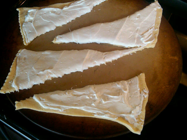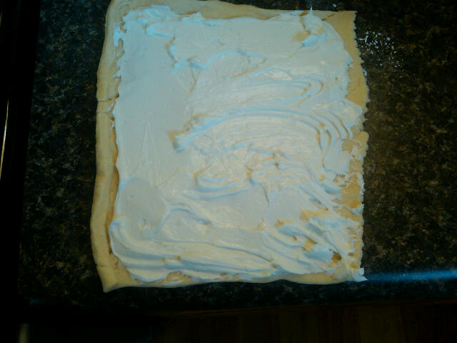 If you purchase the whipped cream cheese, my preference, you can just spread it on as is. Today, I only had the eight ounce block, so I softened it for about 20 seconds in the microwave and then added one tablespoon of the half-n-half, stirring them together to make a nice spreadable cheese. Then, divide that mixture in half and spread each square of dough with half of the cheese. Separate each square into their perforated triangles, there should be four per square. Roll up as you would a regular crescent, starting with the short side and rolling toward the tip.