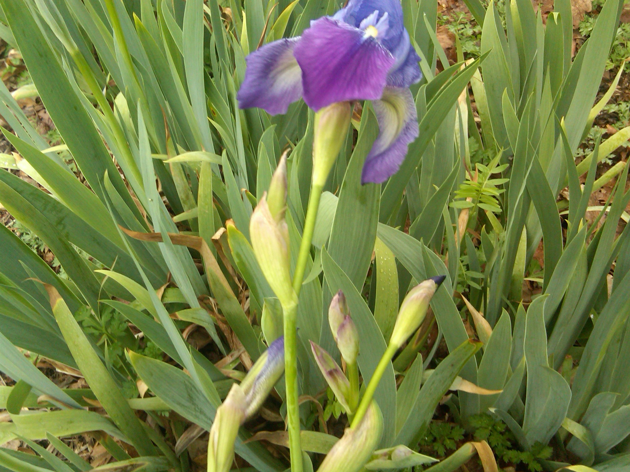 Snow after the trees have budded and spring flowers are nodding their beautifully colored heads at us, not a good thing. My trio of early blooming rhododendrons often get bitten back in infancy, their fragile lavender blooms like sheer silk become brown and wither after a late frost or freeze. My first purple iris winked at me yesterday, fully bloomed on a stalk with two sisters waiting to join it. All around it thick swollen buds are waiting to follow. A freeze would kill them now. But they are too widespread to cover with light materials and my husband thinks the weight of a covering might also break their fragile stalks. I am hoping they survive, that we will only get this soft rain and stay above freezing.