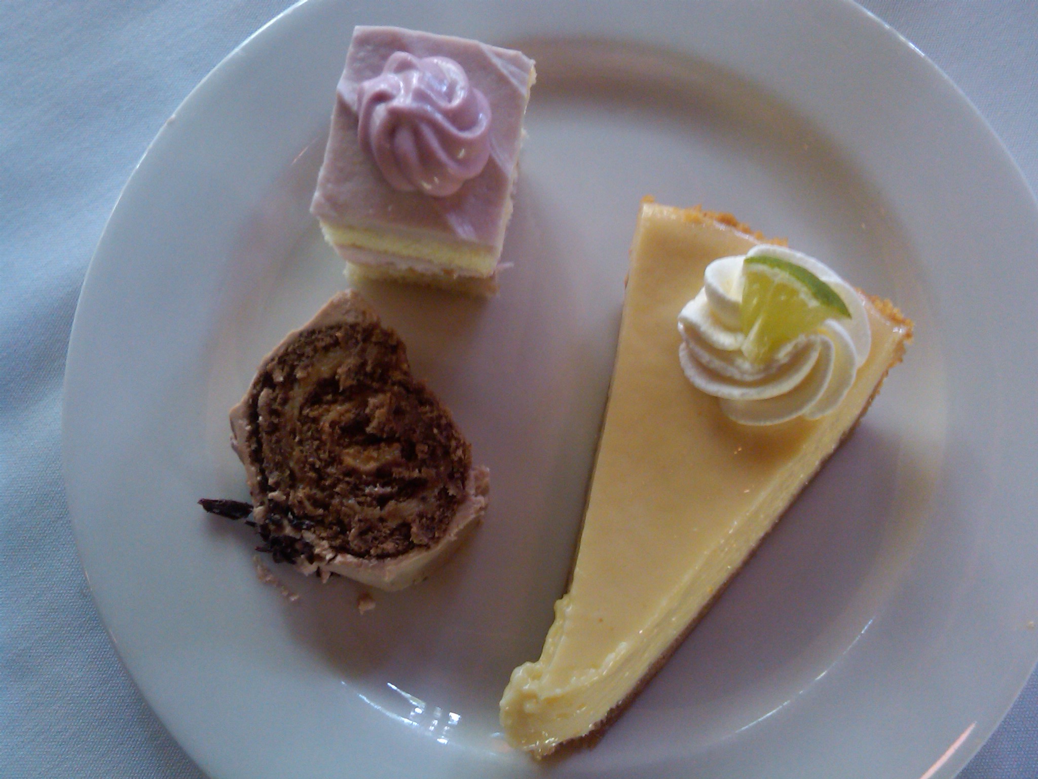 I did both – starting with its photo. The lady beside of me did the former first and then photographed mine before I devoured it. Key lime pie, raspberry torte and chocolate peanut butter roulade – yum!