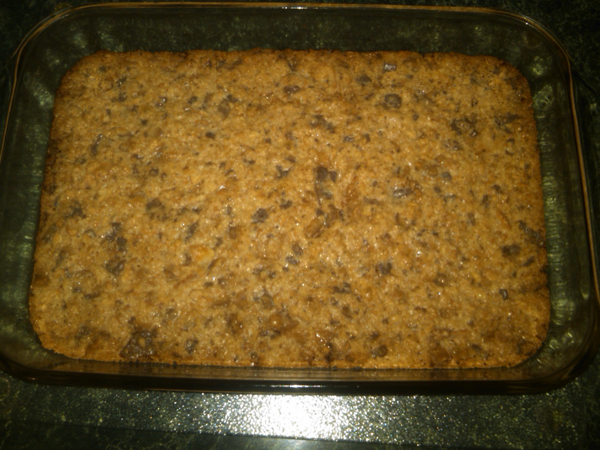 Mix together and pour into a well-greased 9 x 13 pan. Bake at 325 for 20 minutes. Let cool and cut into squares.