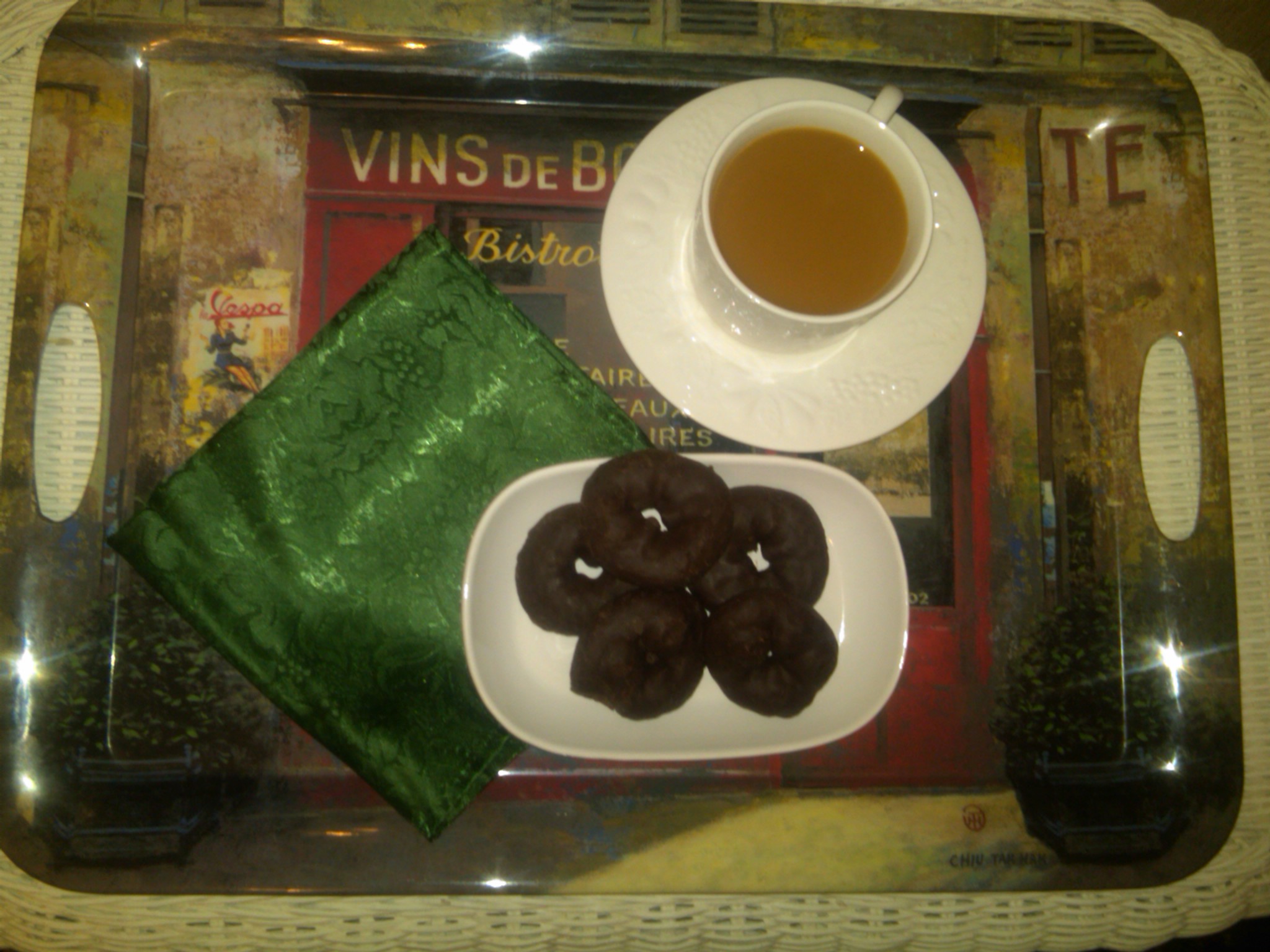 Aah! What is better than an indulgent breakfast of coconut kahlua coffee and chocolate doughnuts? Especially at those times of the month when chocolate cravings abound. And to partake of such a treat is like starting the day in the South Pacific. I feel as though I should be surrounded by giant palms and rattan fans circling from the ceiling. I suppose a wicker chair and table will have to do.