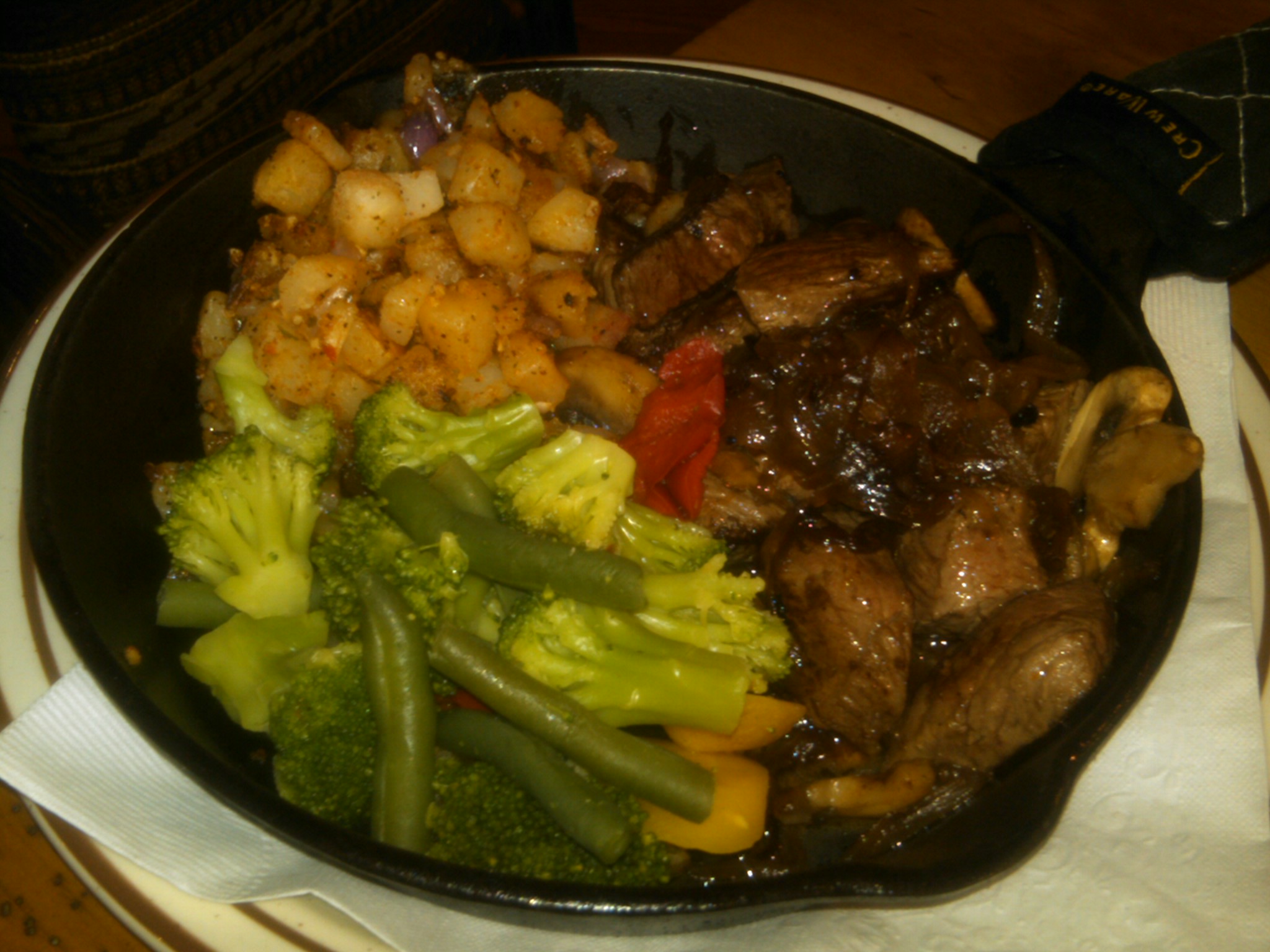 This time it’s the entire meal that gave me inspiration – our favorite of the whole trip. At the Blue Bell Restaurant in Custer State Park in South Dakota, we dined on Buffalo tips with fried potatoes and sautéd vegetable medley, served with a tall square of extremely moist corn bread.