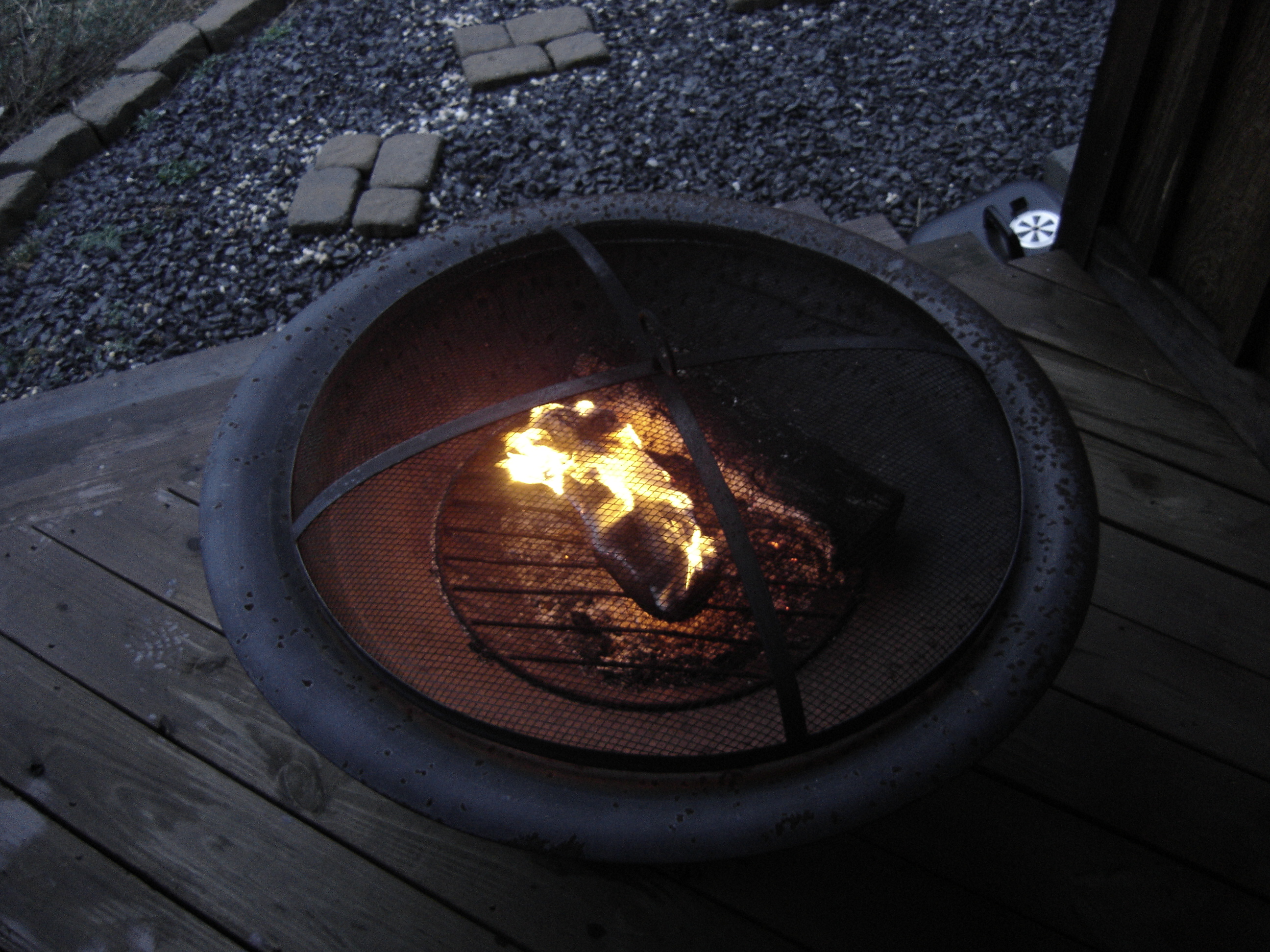 By the way, do you have some kind of fire brick or something under your little deck fire? We personally have burned a hole through a deck, and tourists up here famously set the decks on fire BBQing, or dumping “cold” ashes in the woods.