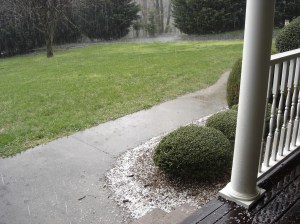 Apparently, we arrived home in the nick of time. Dark clouds loomed overhead and we rushed to take care of the animals before the rain poured down. We weren’t prepared for what did pour from the sky. It started as rain and then got louder as the lightening and thunder cracked the sky open and hail poured from the heavens. It beat at the windows and the roof and the vehicles that were outside of the garage. It bounced on the deck and the sidewalks and I tried to snap a few pictures.