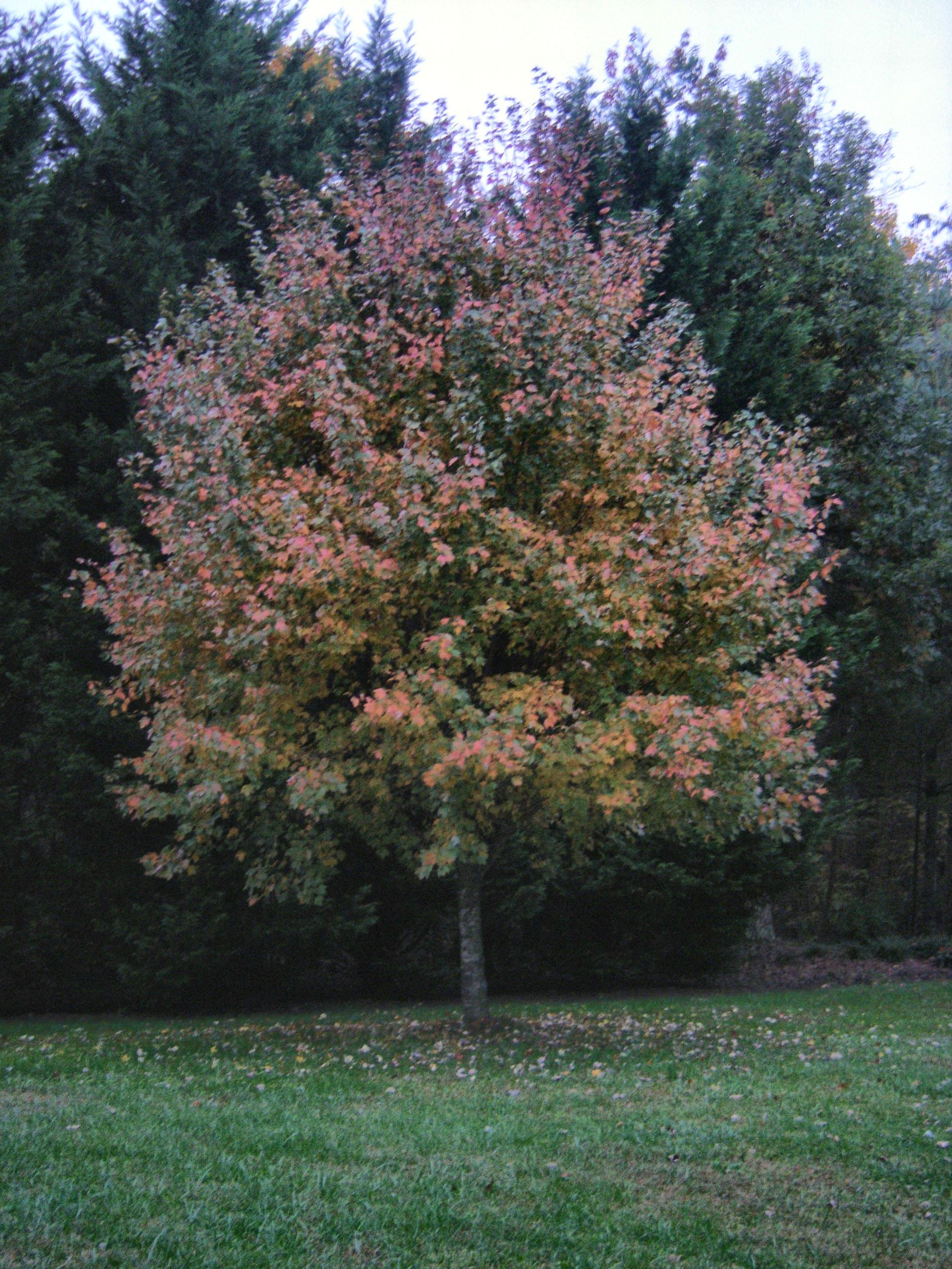 The maple outside is still dressed up in colorful costume.