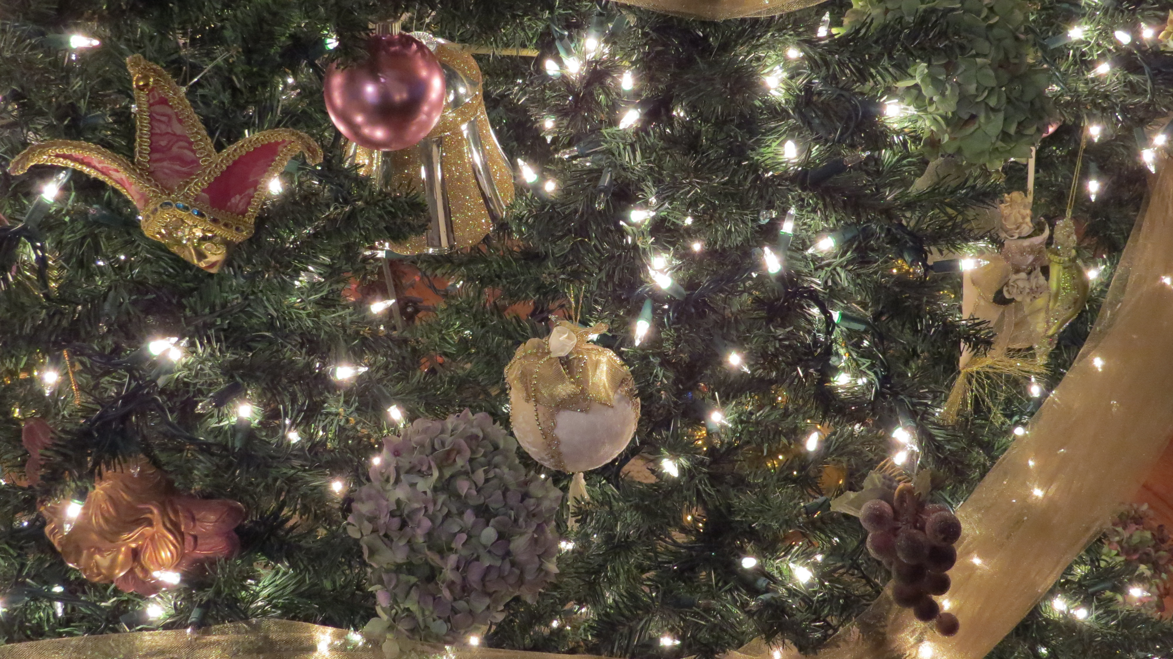 At first my husband thought I was a bit nuts. But after he saw the nice effect, he was quickly won over. So hydrangeas have a new place on my tree, along with the routine shiny bulbs, sugared fruit, and a few things picked up from travels like a Venetian mask.