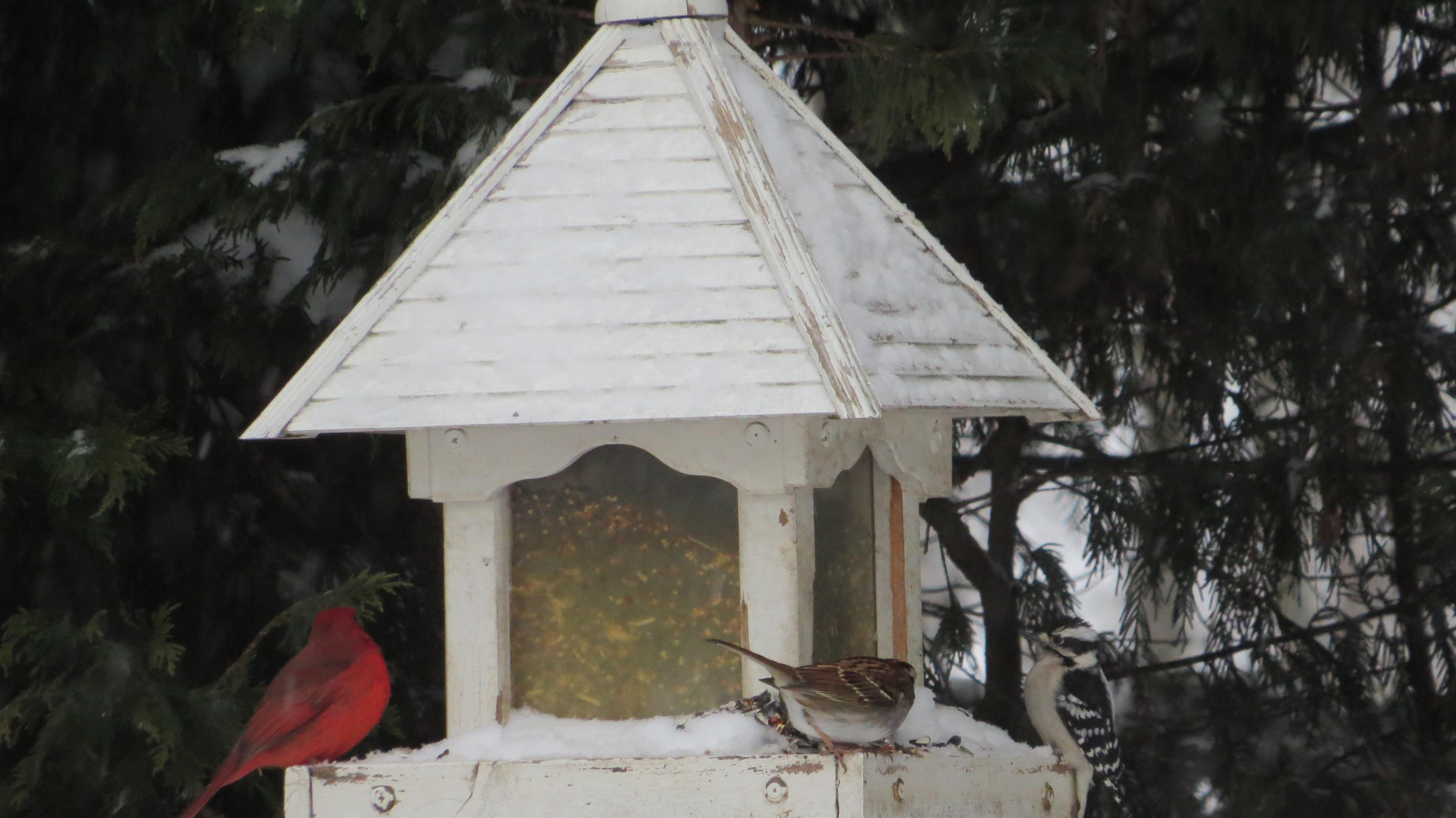 I was in Indiana for a month-long holiday visit. We were getting such a kick out of watching the birds in the feeders, and 12 squirrels play & eat breakfast every morning.