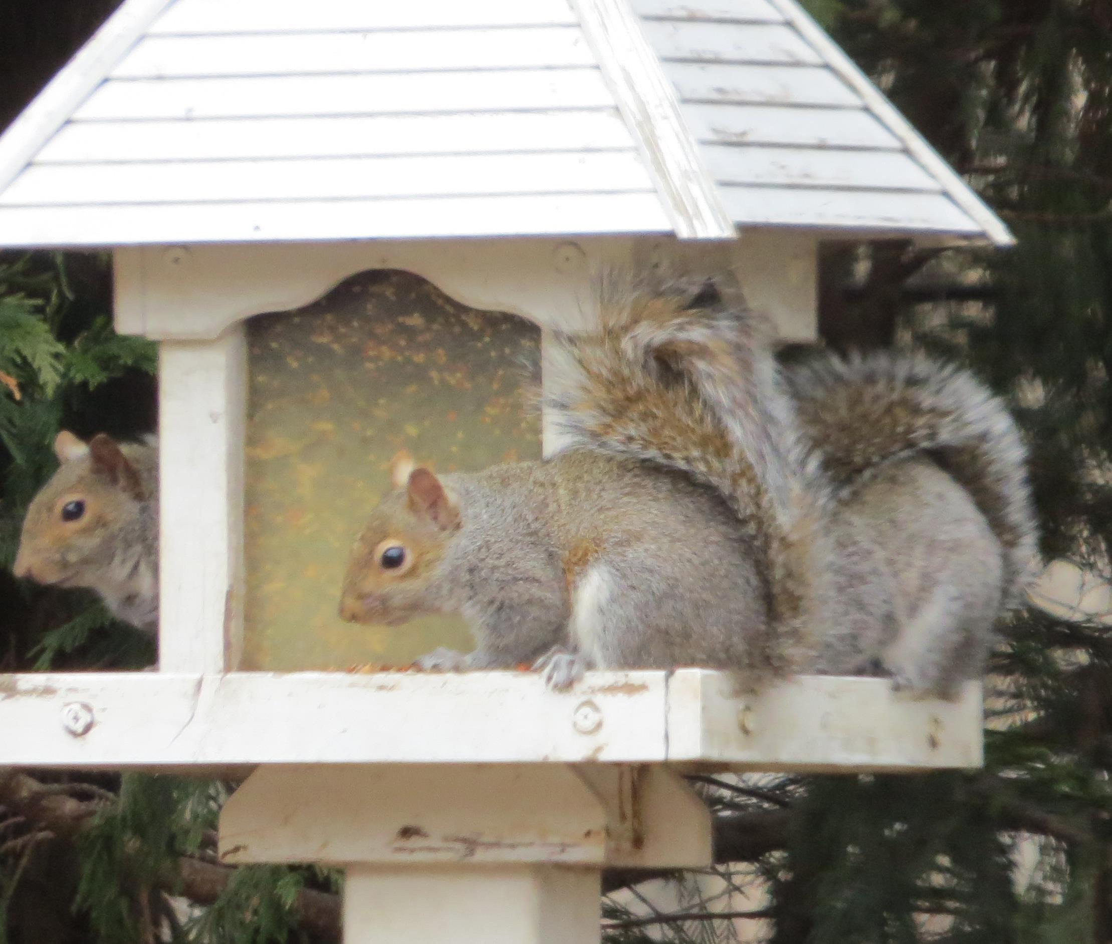 And the squirrels jumped out of the tree limbs and assaulted the fresh supply of seeds.