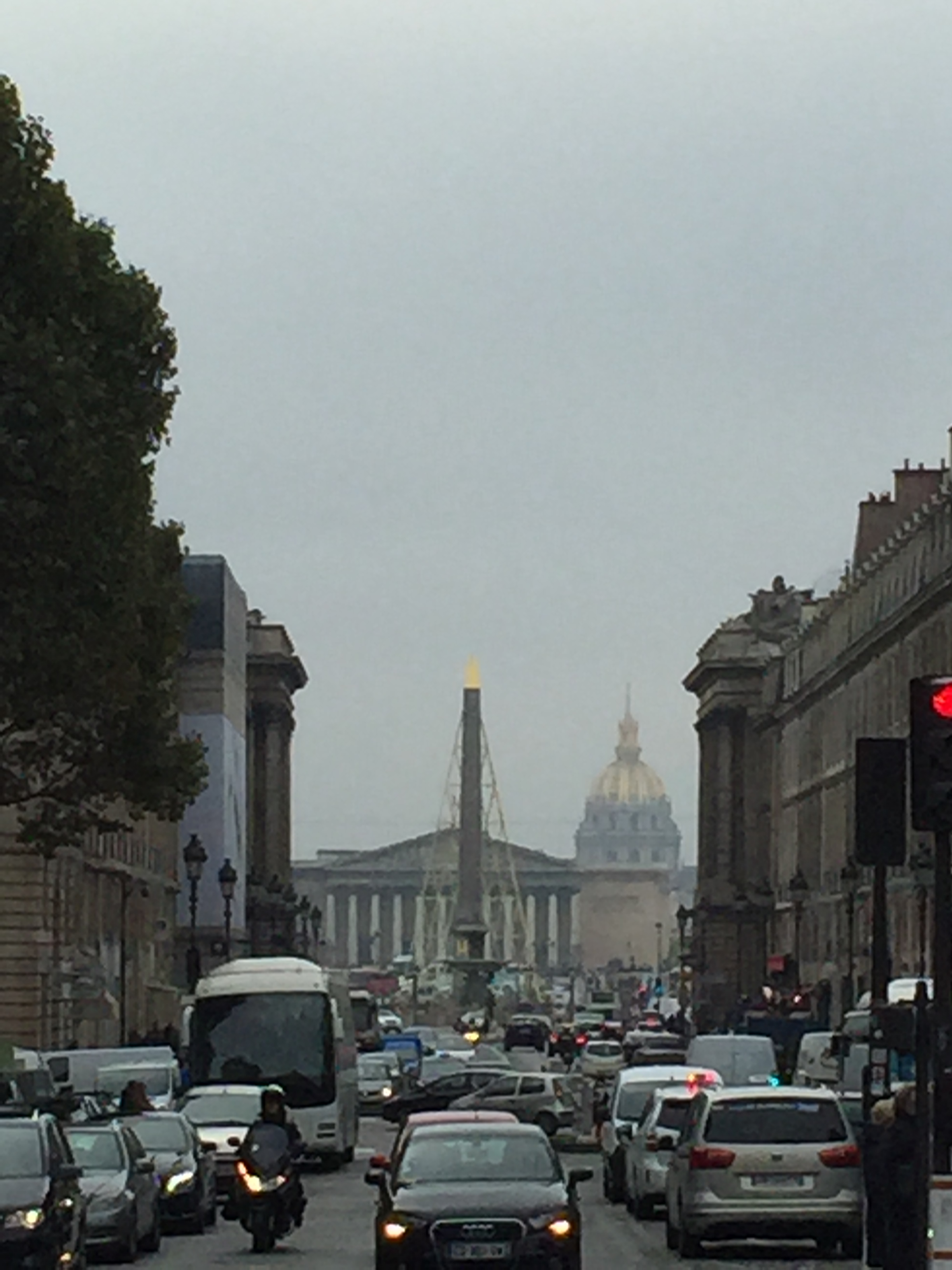 The golden tip of the obelisk from the Temple of Ramses II–sometimes called Cleopatra’s Needle–could be seen even in the fog. We were in Place de la Madeleine looking back toward Place de la Concorde.