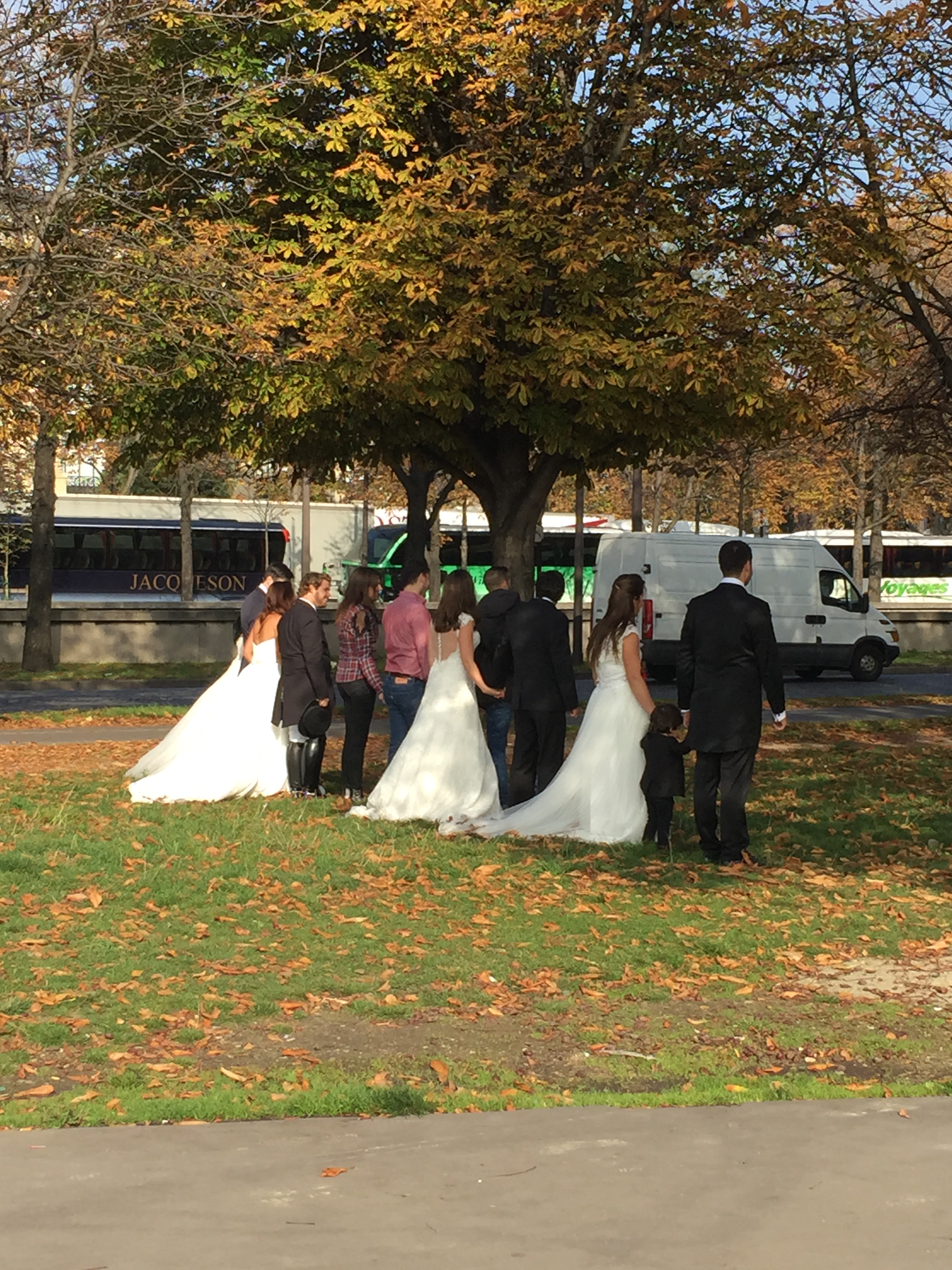 And in the park beside the river, a trio of brides posed for photographers, whether real or models, we had no idea.
