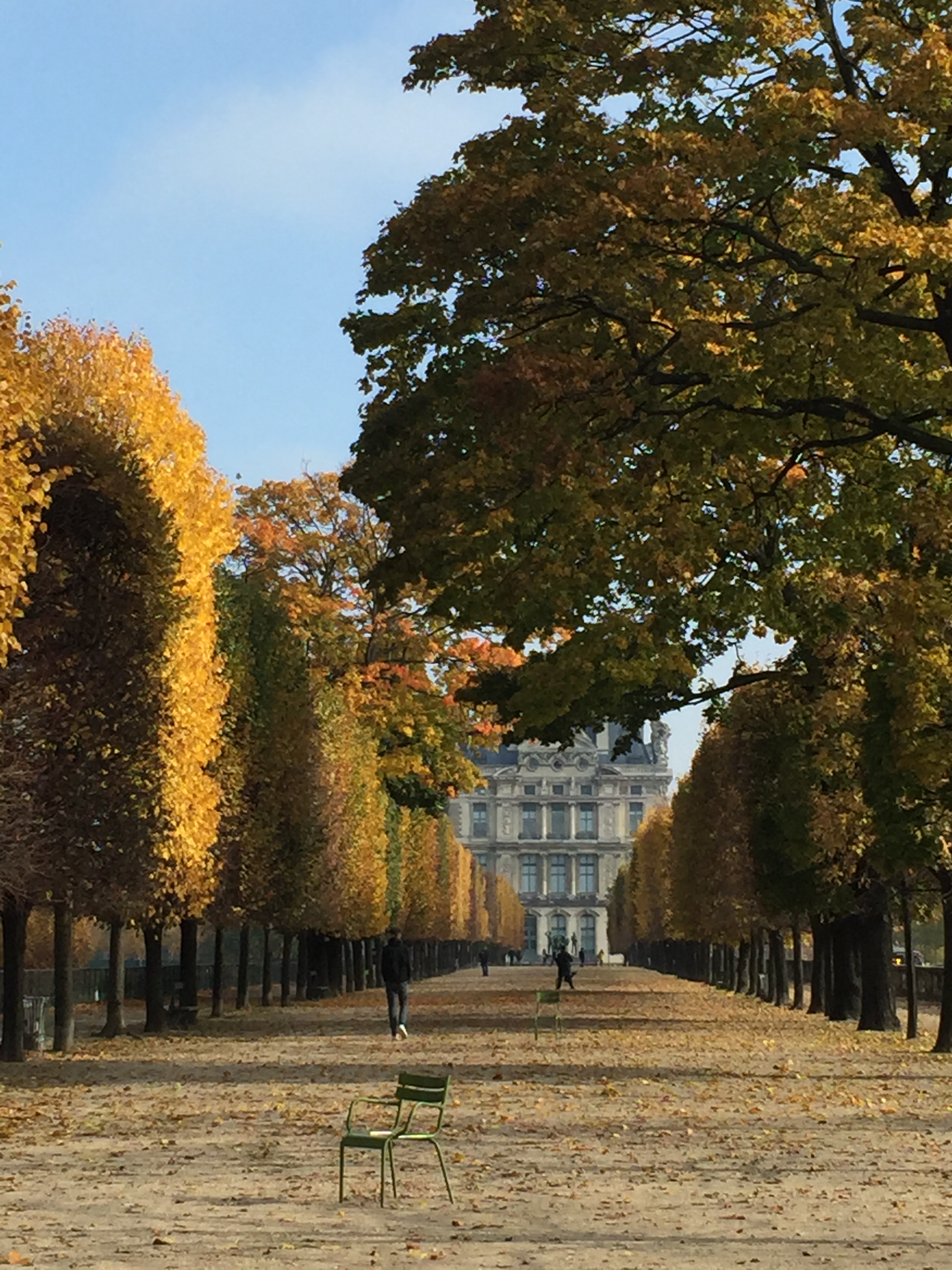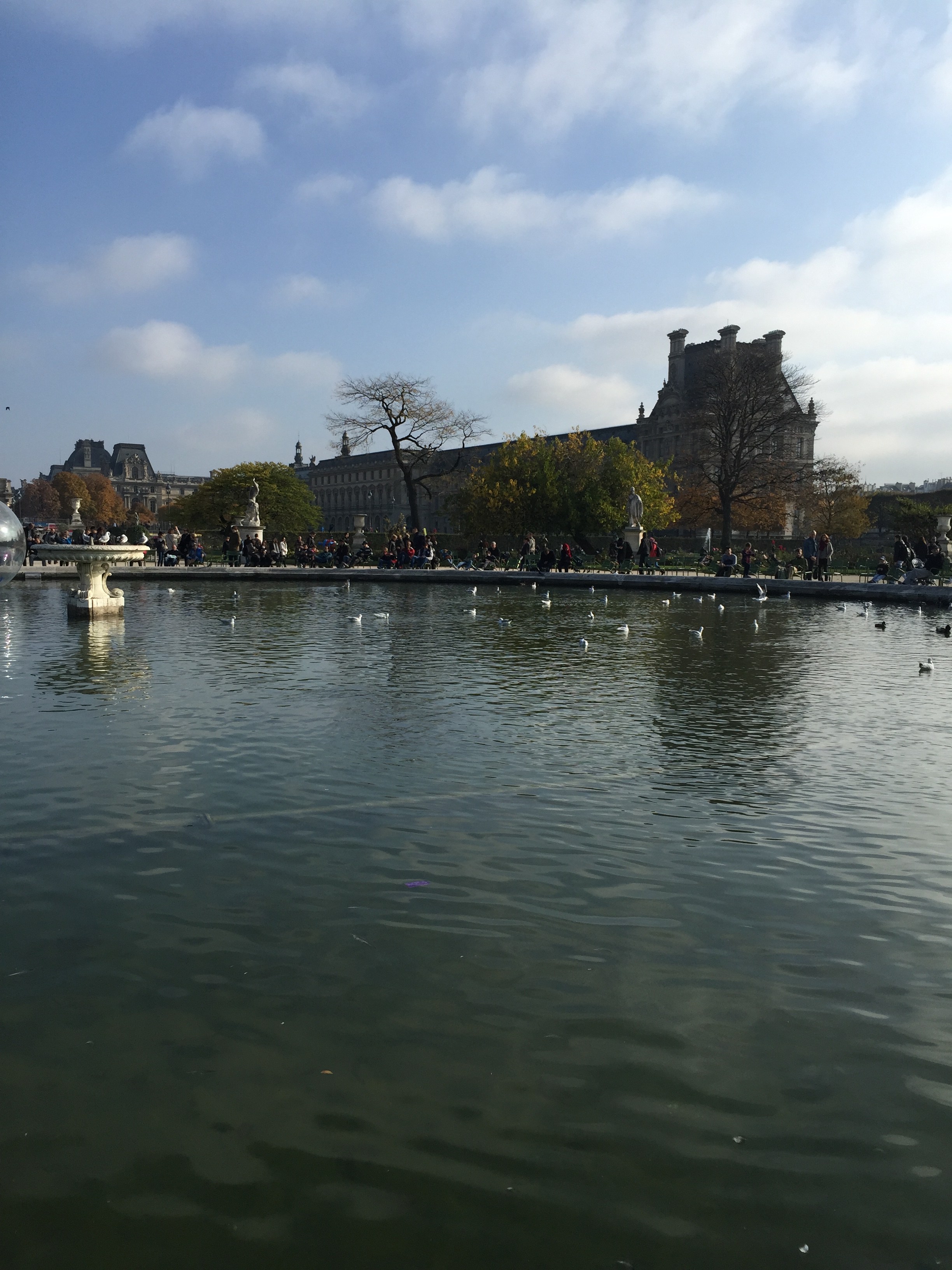 Onward, into the Tuileries Garden, we drank in the beauty of the Louvre as a focal point beyond the many leaf-littered paths and glistening ponds, as well as some hot mulled wine–known as vin chaud.