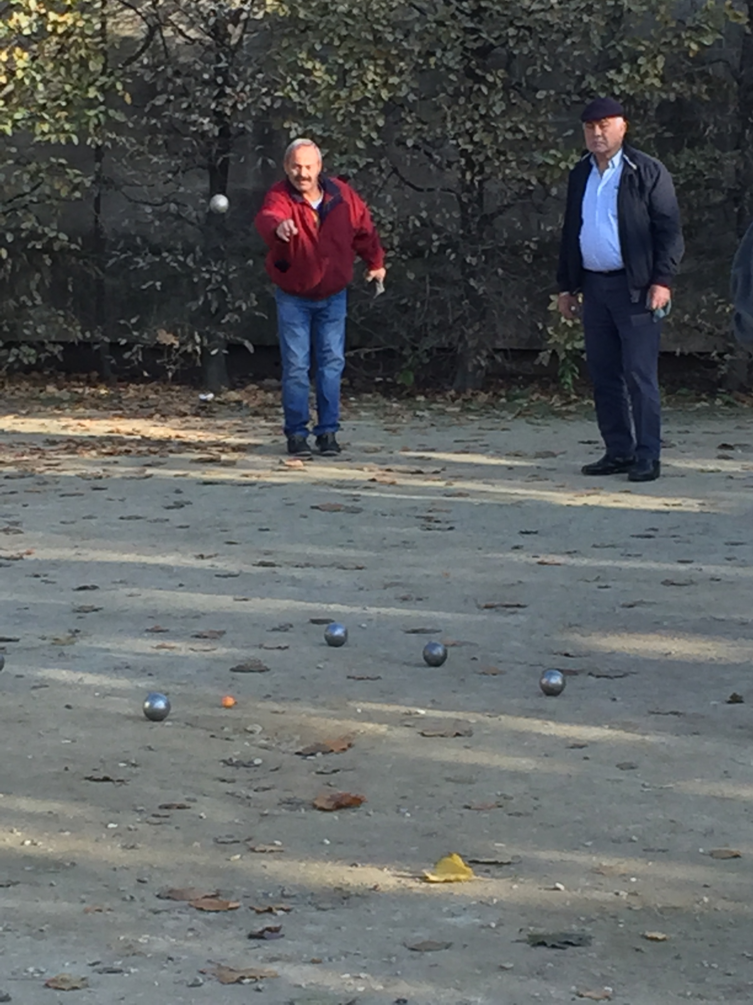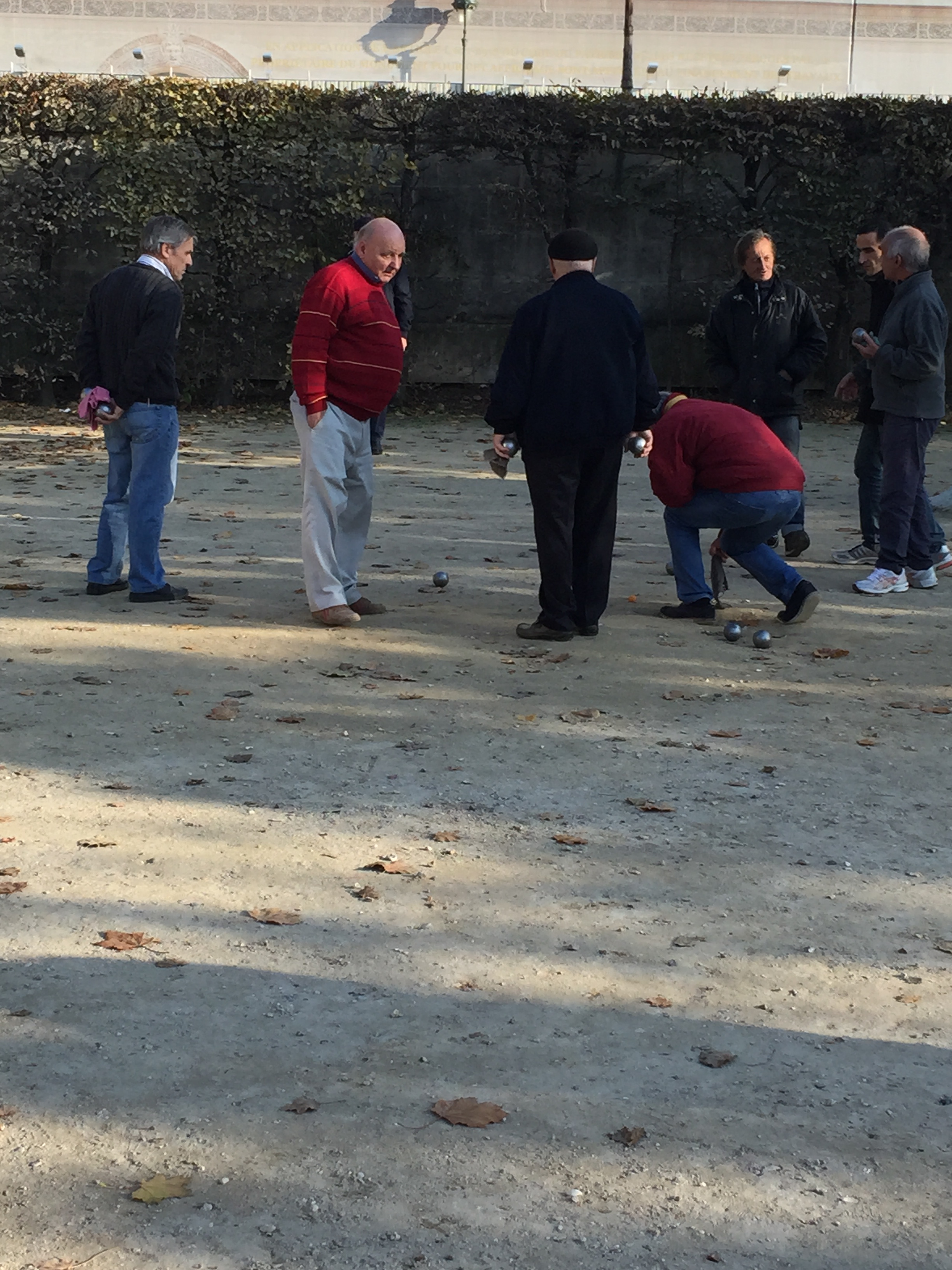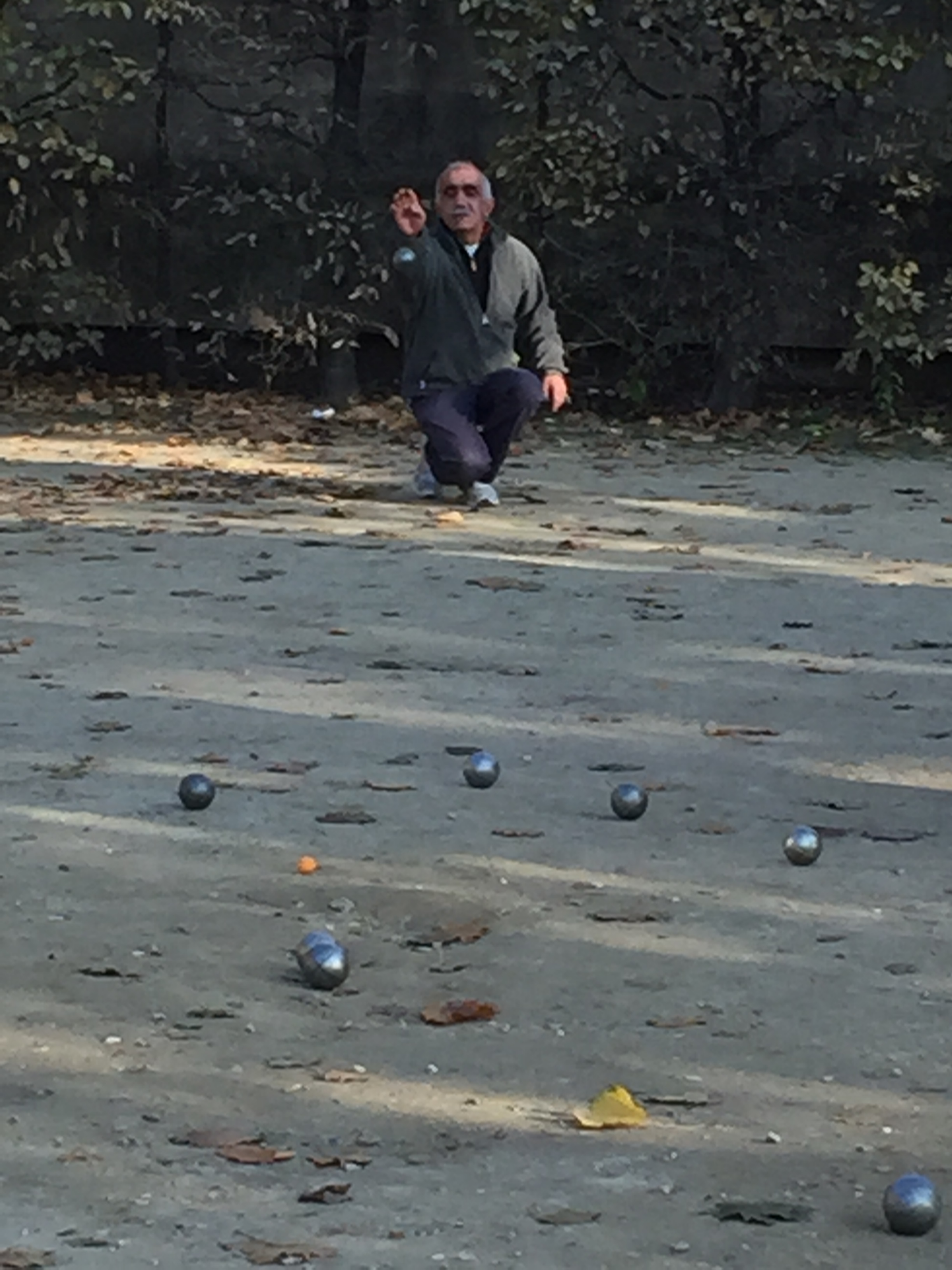 This is another of the glories of Paris. Personal space isn’t a broad swath, but a narrow sliver. And people connect, talk, play in the park whether seven or seventy. I was so intrigued by the game of Petanque being played by the gentlemen above. And they were not bothered by my obvious attempts at capturing them in action.