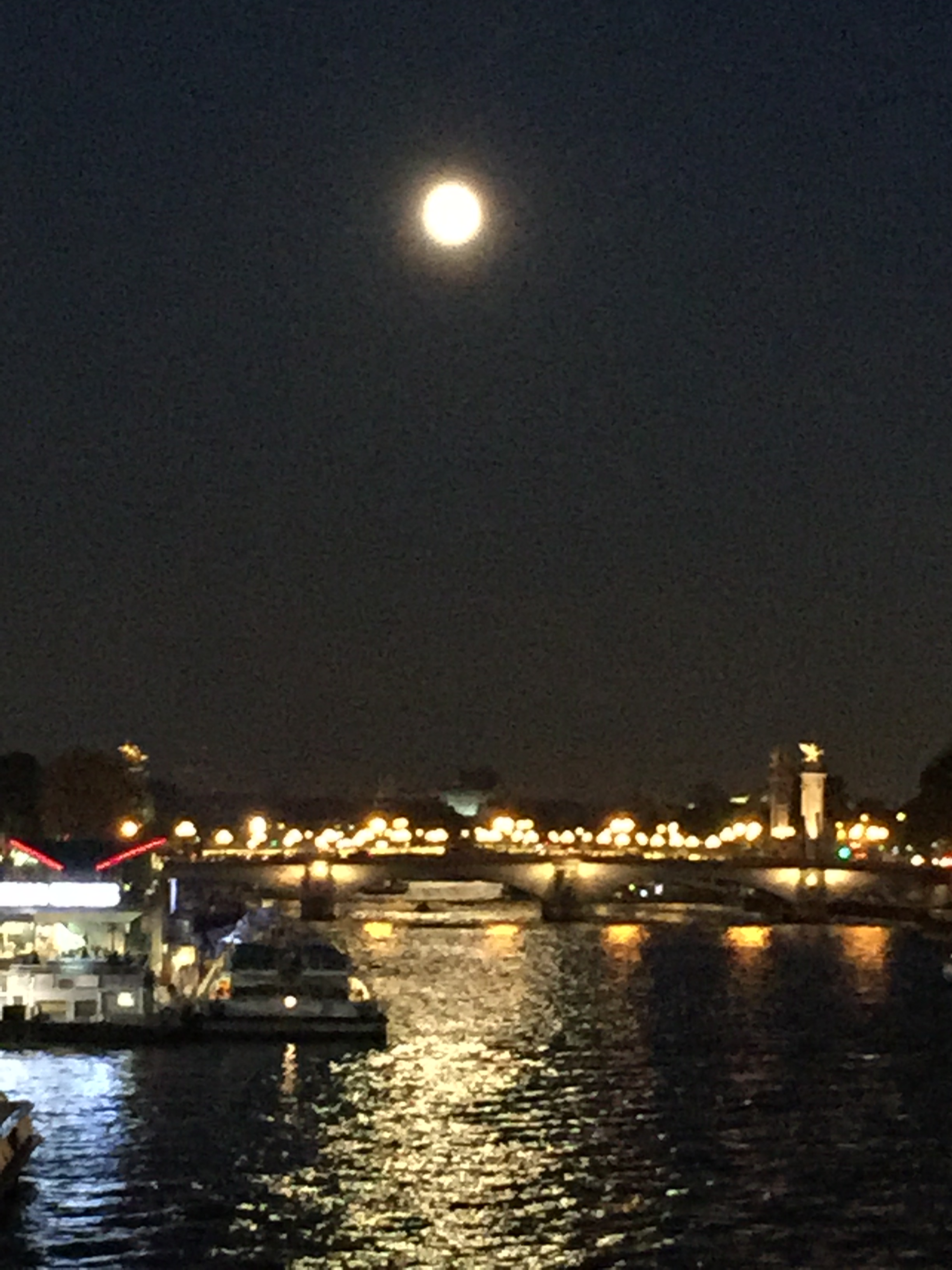 But Paris wasn’t finished with her show. Lit by a full moon, the Seine sparkled and gleamed. It looked as if the moon had breathed a ripple of golden honey into the river.