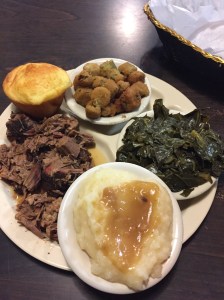 I ordered the smoked brisket, collards, fried okra, potatoes and gravy and cornbread muffins. I’m not ashamed to say I ate most of it. It was delicious. And I passed up the peach cobbler.